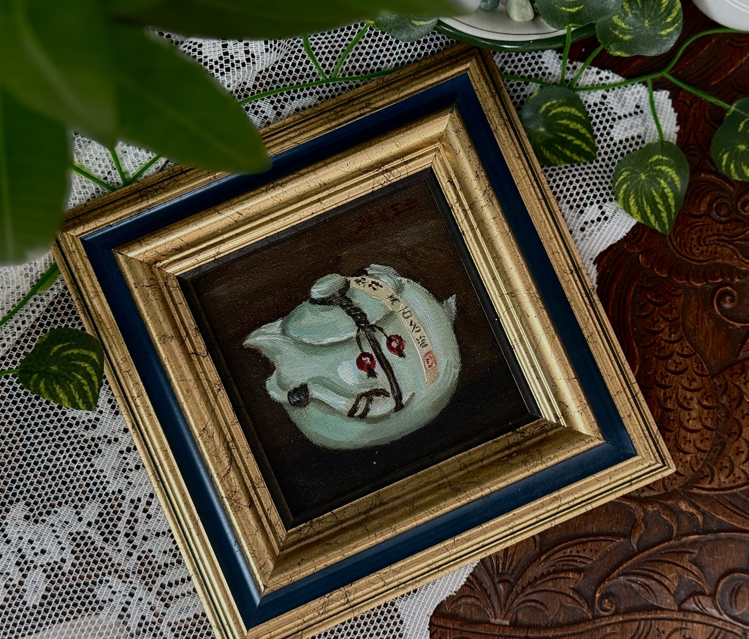 Original Oil painting on 11×11 cm (4.3×4.3 inch) canvas board varnished with a gloss varnish, with frame. Art work comes with a certificate of authenticity.